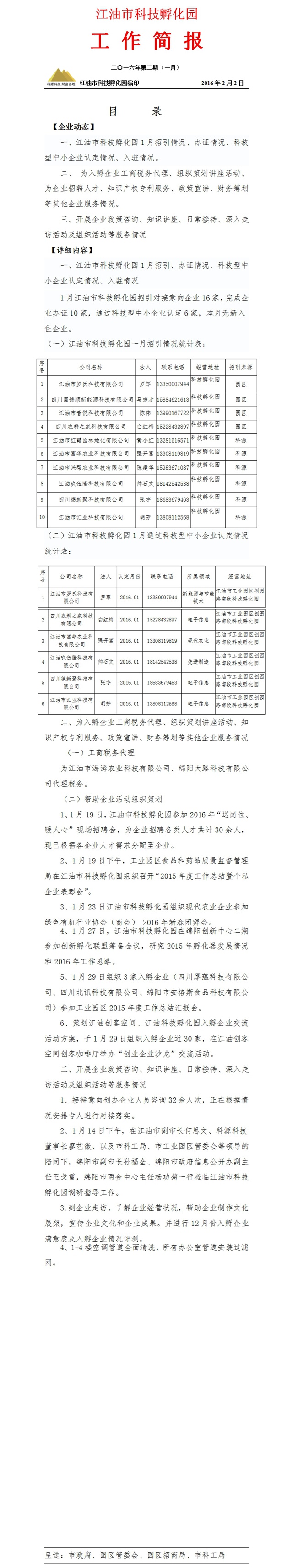 江油市科技孵化園二零一六年一月工作簡報